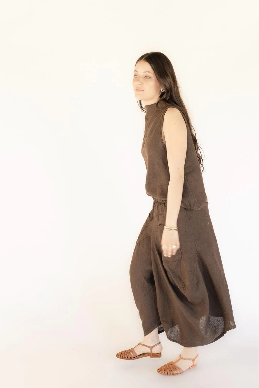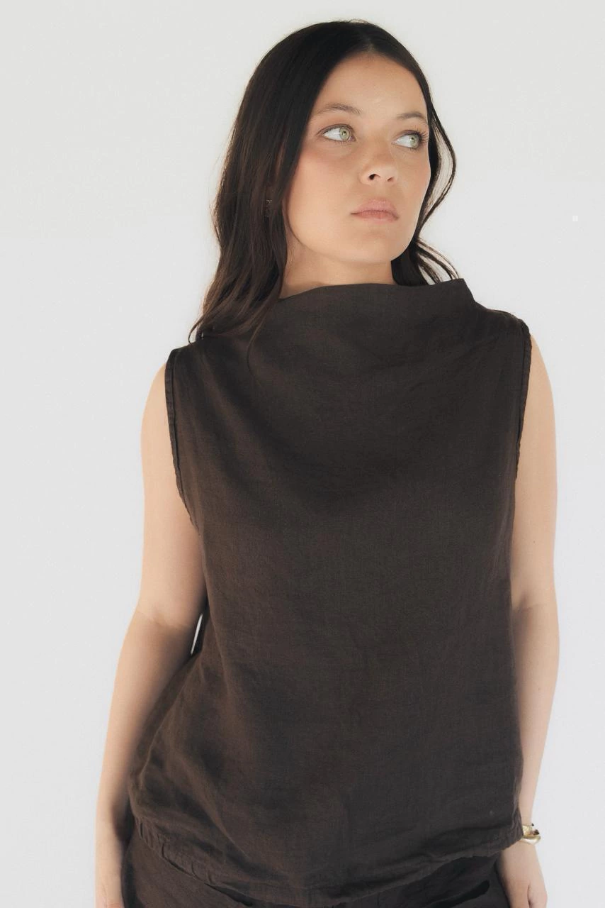 Minimalista y versátil, la musculosa de lino es un básico elevado que se adapta a múltiples combinaciones. De corte recto y cuello alto, aporta elegancia relajada en los días de verano y se convierte en una pieza clave del guardarropa estival.