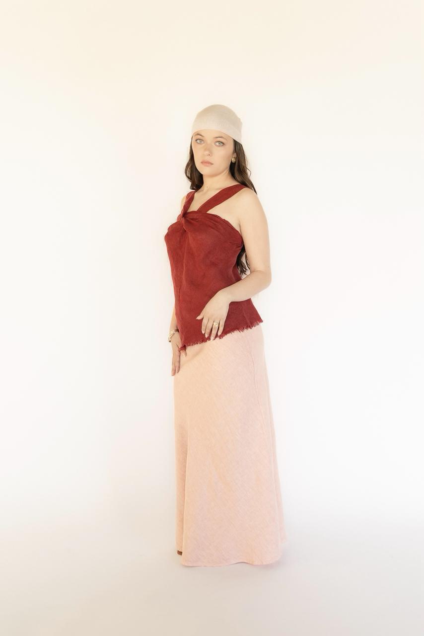Confeccionada en lino de textura suave y natural, esta pollera larga se distingue por su caída fluida y silueta simple que estiliza. De diseño minimalista y atemporal, se adapta fácilmente a distintos estilos: elegante con sandalias o más relajada con remeras básicas.